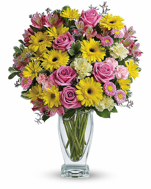 Realizzato con fiori freschi di stagione in tonalità rosa tenue, giallo brillante e bianco crema, trasmette gioia e affetto in ogni dettaglio. Le varietà floreali possono variare in base alla disponibilità, ma l’equilibrio cromatico e lo stile vivace restano sempre fedeli all’originale.